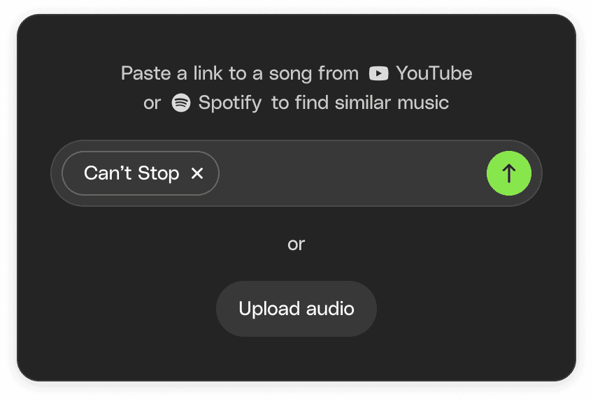 If you’re searching for music, you can paste a link from YouTube or Spotify — or upload an audio file — and we’ll surface tracks with a similar sound and feel.